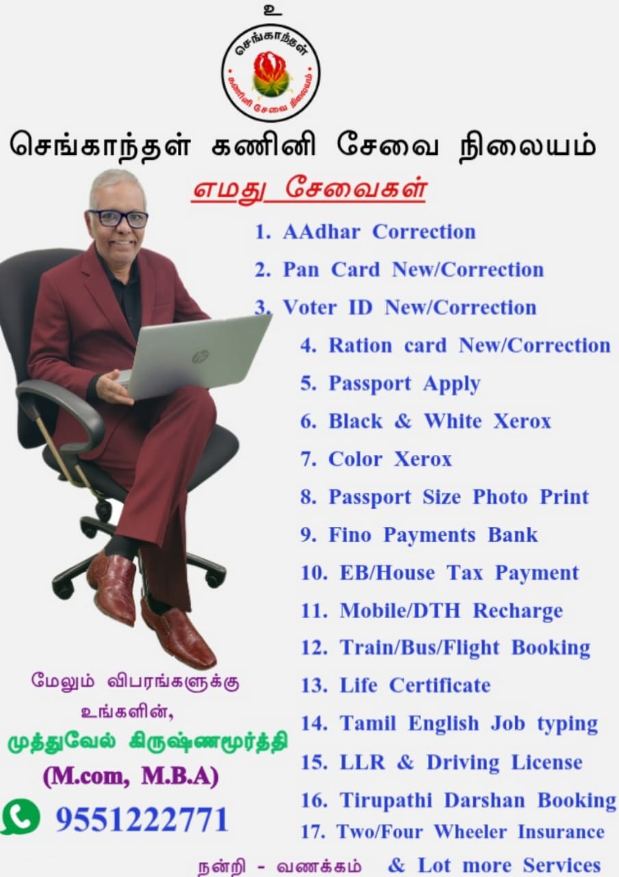 Senkanthal Computer Service Center, located in Lazar Nagar, is your one‑stop solution for essential documentation and banking-related services. We help you complete important procedures quickly, correctly, and without hassle.